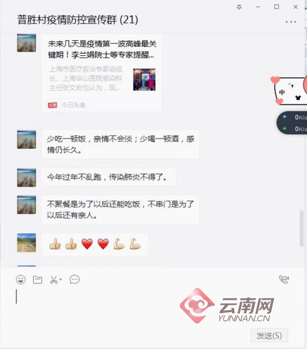 这不,宁洱县普义乡普胜村党支部书记白慧兰近期朋友圈和各级各个工作群中都是关于疫情的各类提醒、防范通知等等,大家在群里相互转发提醒,一些不在家中的老百姓就能第一时间了解情况。普胜村村民们纷纷表示:“我们村组呢微信群天天响,发给我们一些科学的疫情防控知识,及时更新疫情防控情况,提醒大家不要聚会、少到处乱跑,有了村民微信群,我们不仅安心,更有信心一起战胜疫情。”