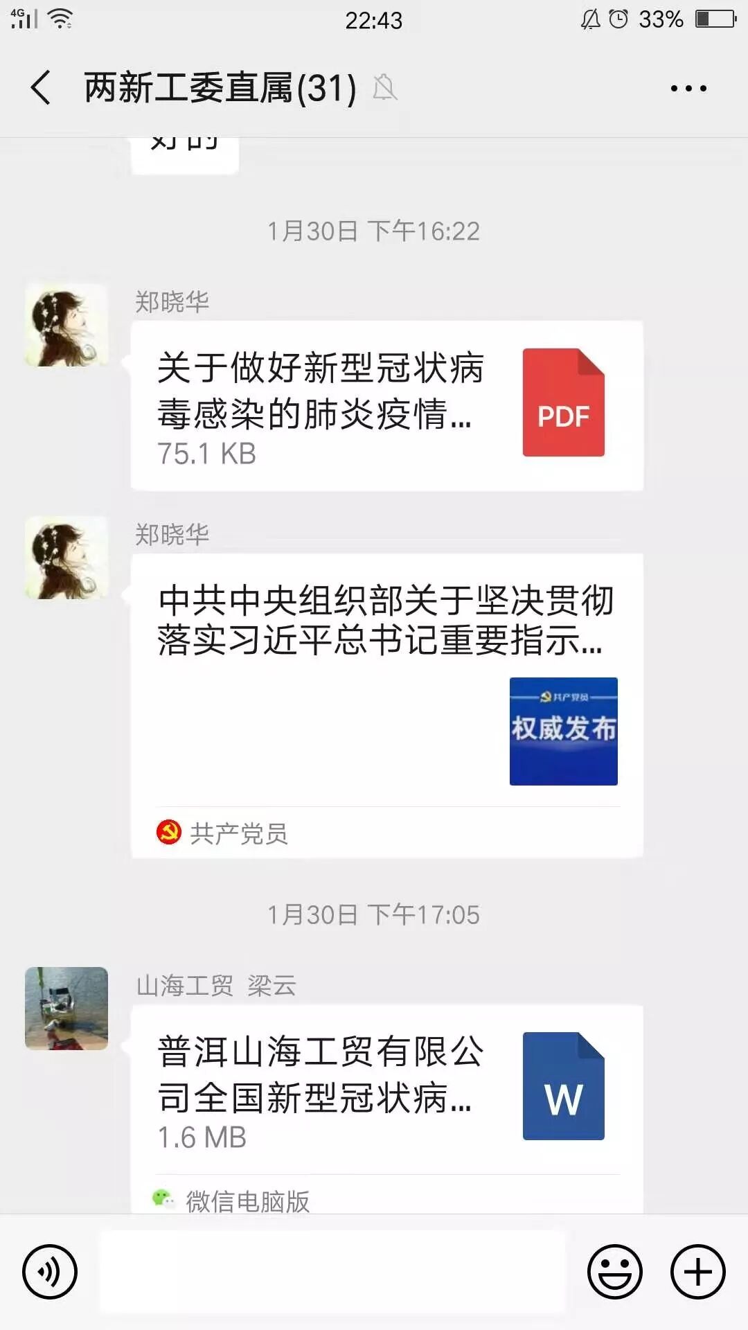 自开展疫情防控工作以来,思茅区委“两新”组织工委按照区委提出的“10个”关键词和“四防四控”要求,及时成立疫情防控工作小组,制定下发《关于做好新型冠状病毒感染的肺炎疫情防控工作的通知》致全区非公企业党组织。充分用好智慧党建平台,建立“微会议”制度,及时推送学习习近平总书记系列重要指示精神,党中央部署和省委、市委、区委的工作要求,引导非公企业党组织和党员在防控一线坚守岗位、践行初心,体现责任担当。同时,积极帮助协调口罩、酒精等物资支持企业做好疫情防控和生产。截止目前,平台推送学习100余条。各级刊发非公企业疫情防控信息20余条,其中中央、省级采用4条。