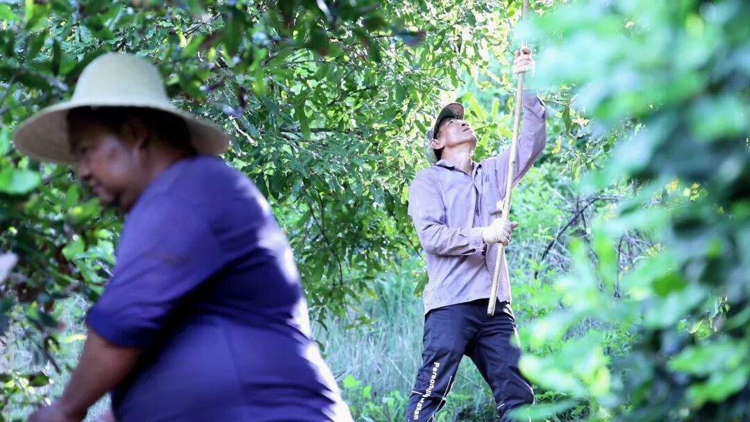 眼下,鱼塘镇挖鲁村坚果种植基地迎来丰收季。漫山遍野的果树上,沉甸甸的果实压弯枝头,郁郁葱葱的枝叶间,一串串饱满的“绿宝石”错落垂挂。村民们穿梭林间,双手不停忙着采摘、分拣,丰收的喜悦写满脸庞。