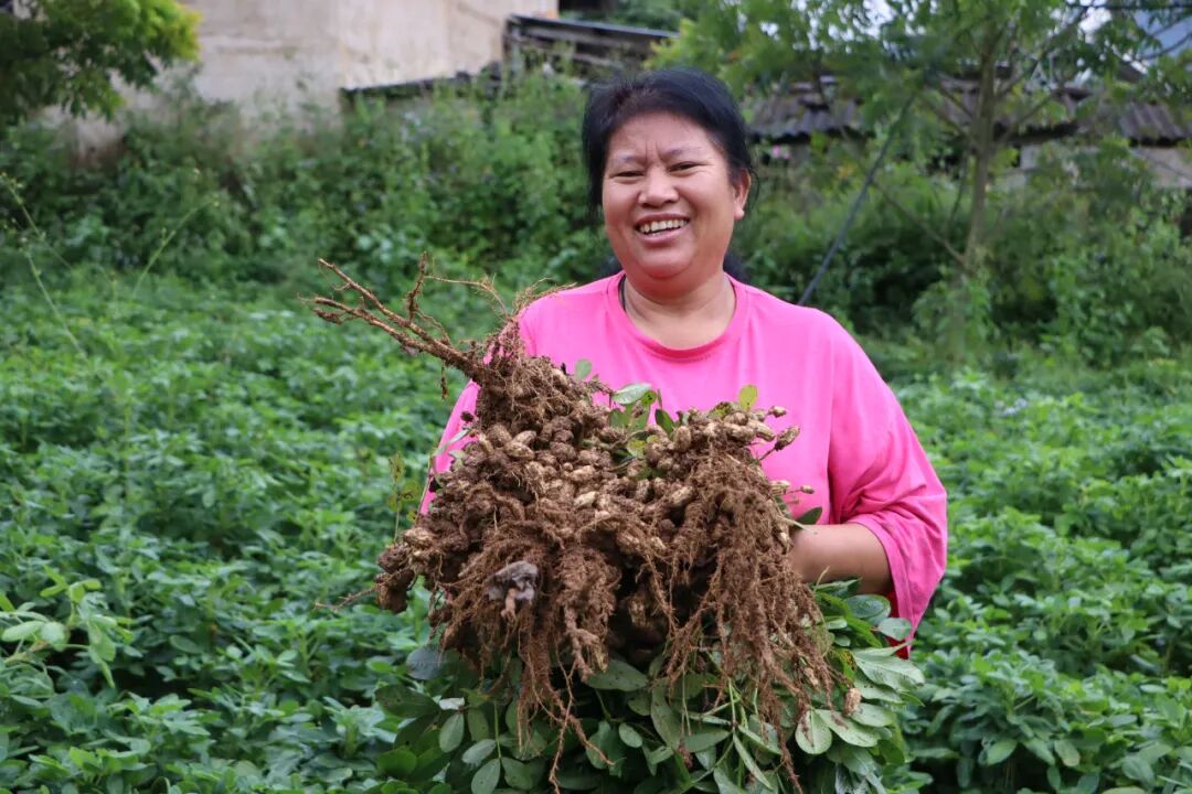 在星火村的田间地头,村民们正娴熟地采收花生,稍微用力一拔,一株缀着饱满颗粒的花生破土而出,轻轻抖掉泥土投入箩筐中,等待摘取。大家有说有笑,丰收的喜悦映照在脸上。