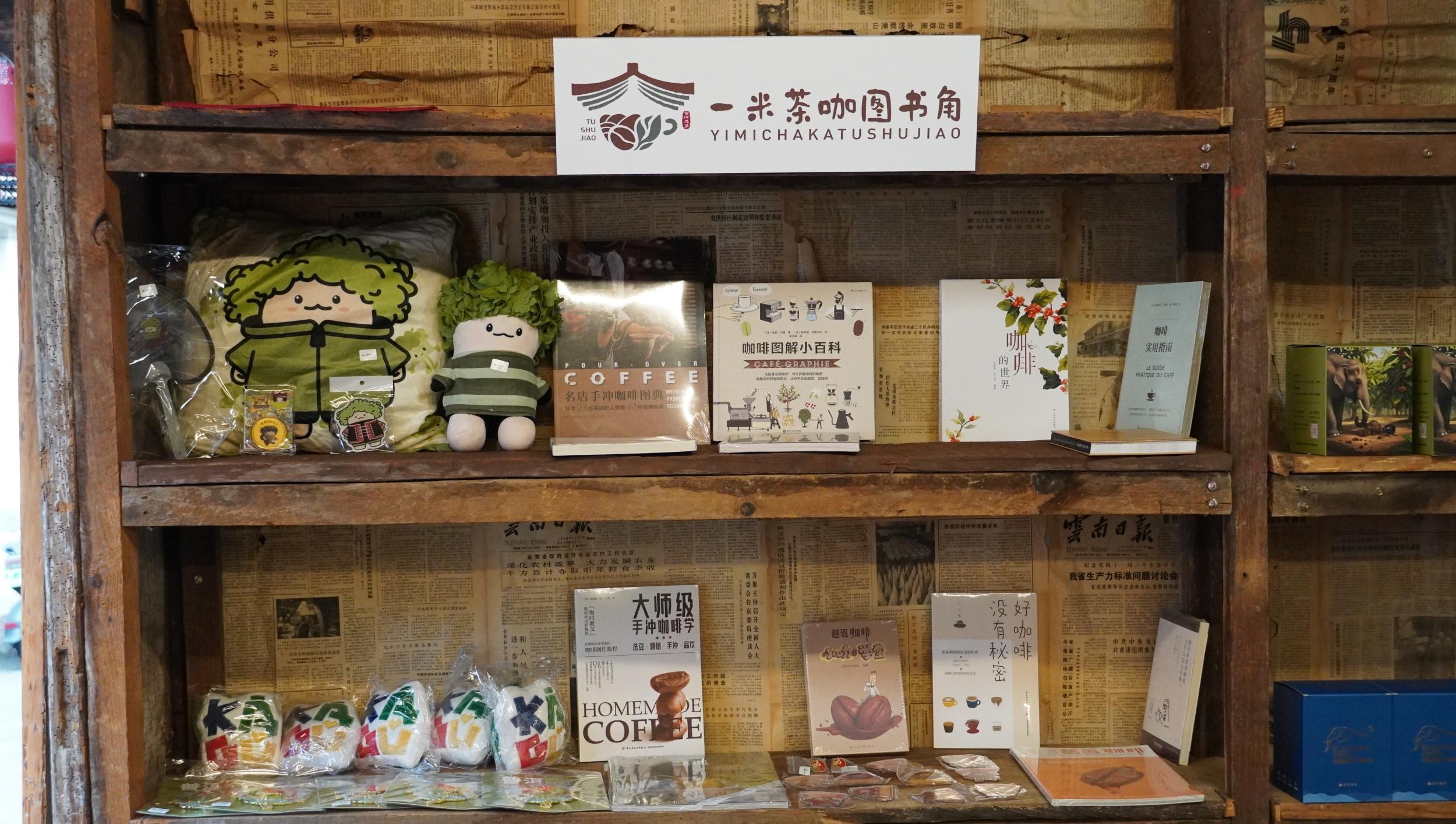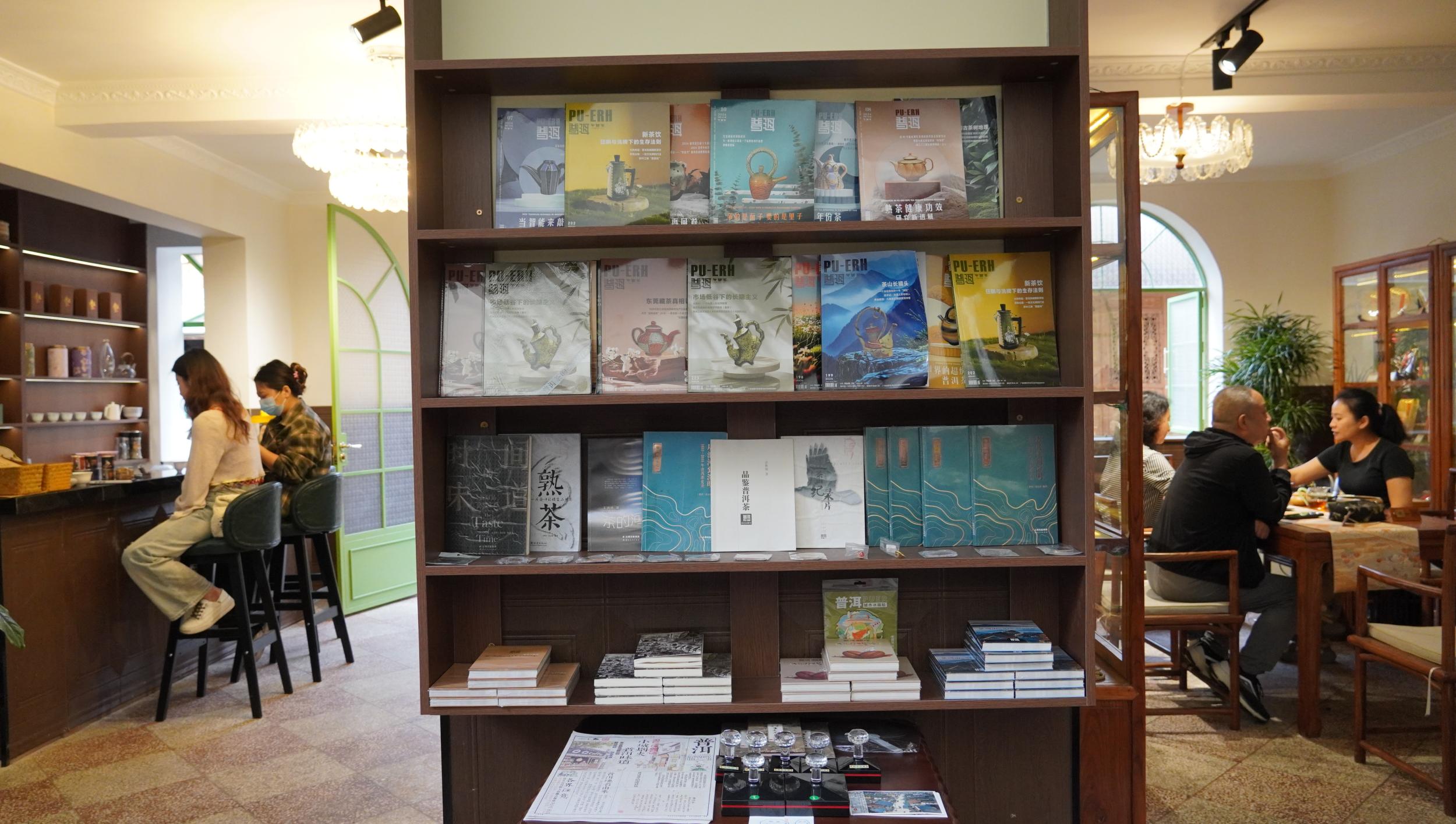 在泷园、八本致祥茶楼等茶咖空间,以及各色民宿客栈里,一米茶咖图书角已悄然布置起来。工作人员正精心布置着图书角,书架上,《茶经》《咖啡品鉴大全》等书籍琳琅满目;“唛嚛”、思茅城市冰箱贴与“普豆豆”等文创产品则在旁错落有致地陈列开来。