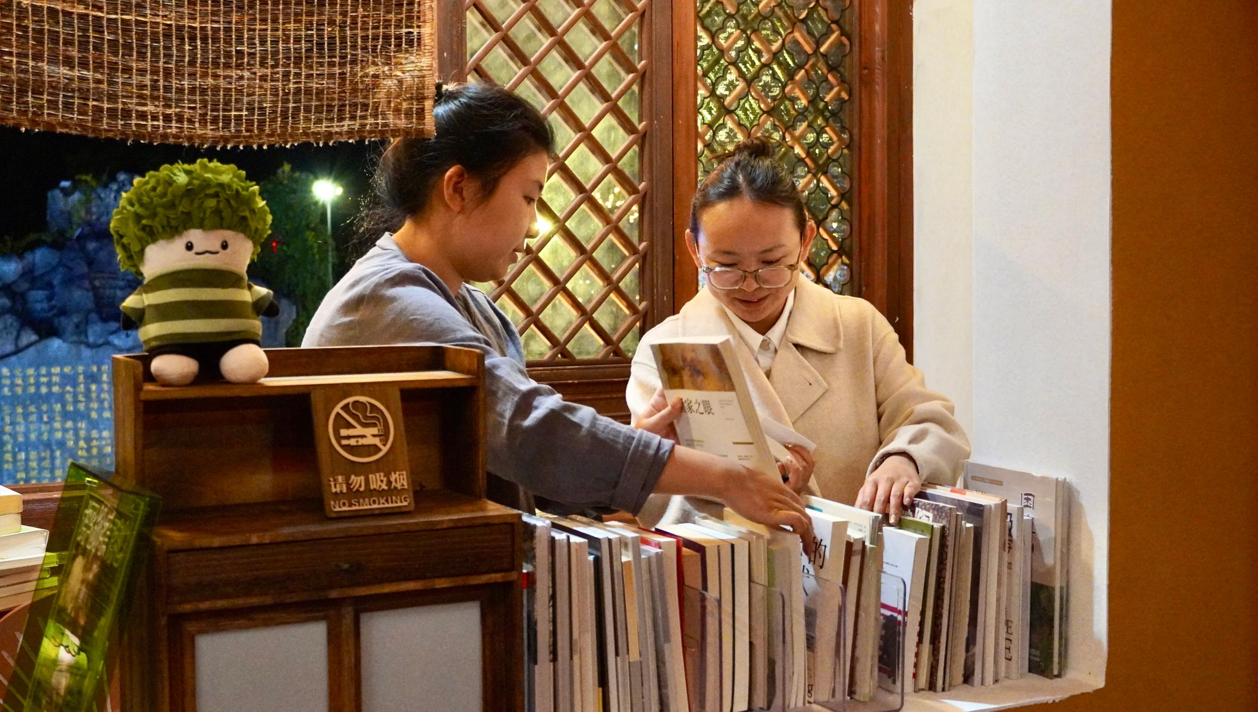 四川游客李萍和朋友在一米茶咖图书角挑选书籍。