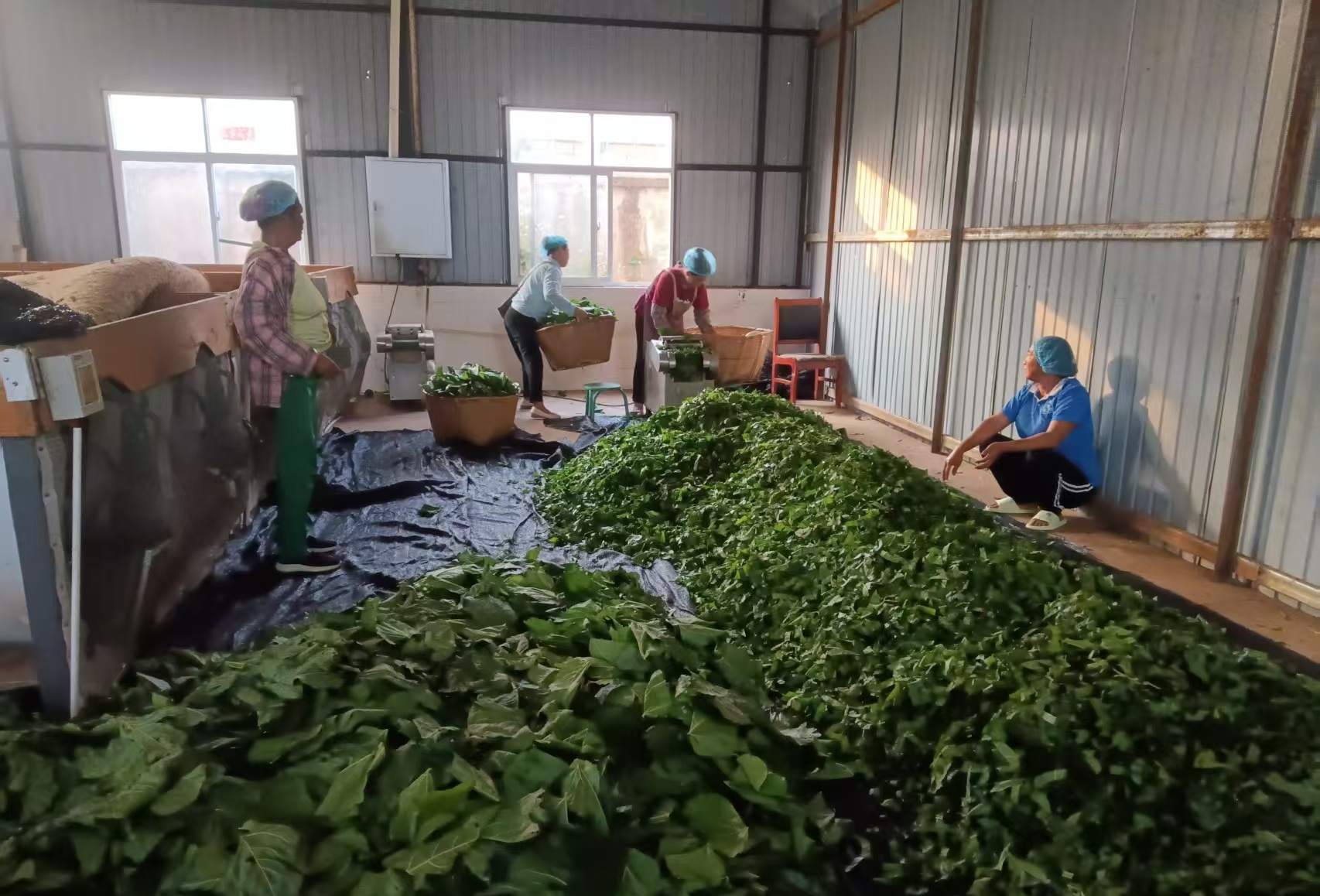 娜允镇芒街村村民正在光伏基地桑叶加工厂务工。