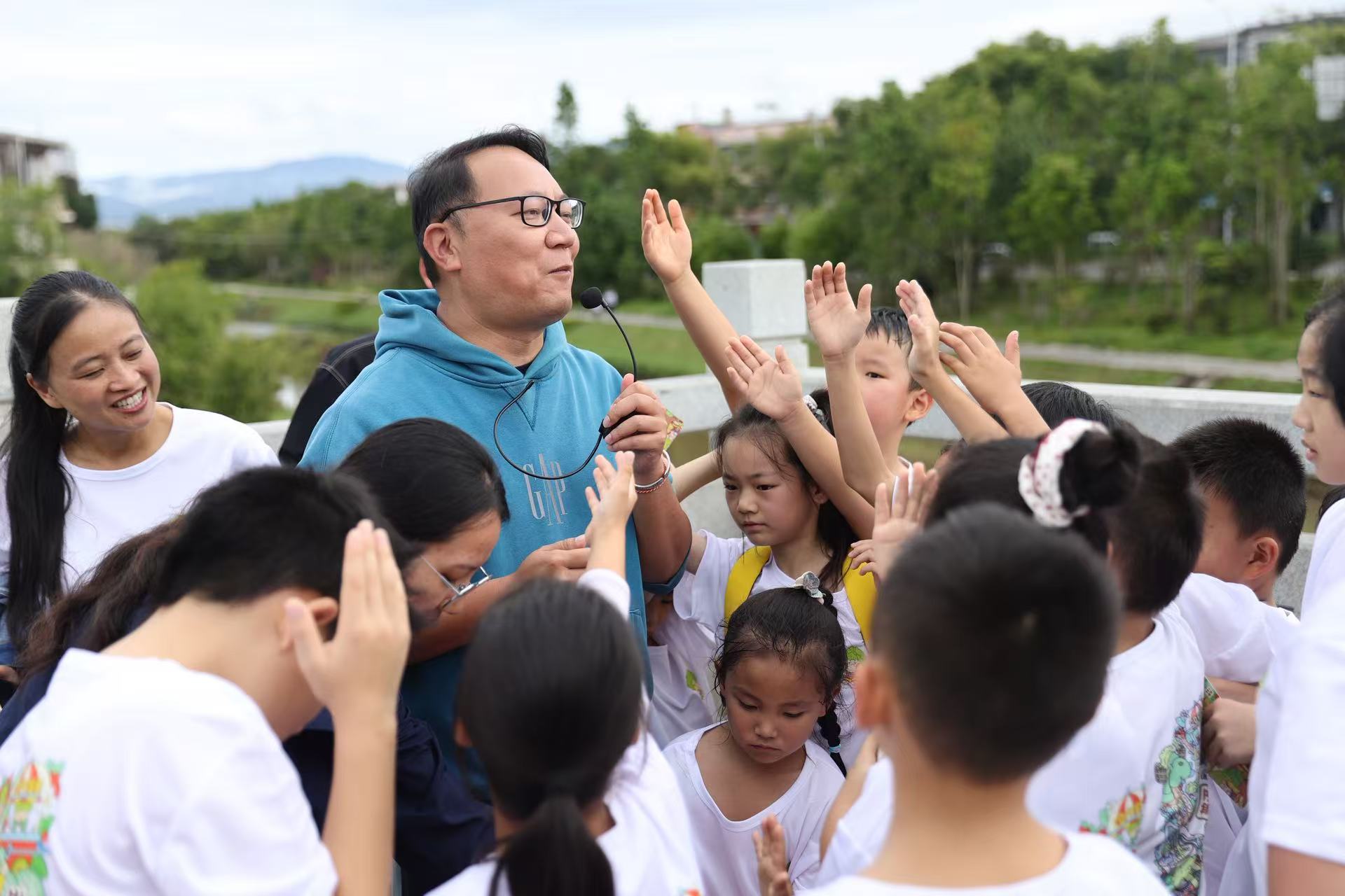 来到老街子桥边的凉亭,NPC小欧带大家走进“思茅河生物世界”。“河里有小鱼、小虾,岸边有芦苇、菖蒲,这些生物都是河道生态的‘守护者’。” 结合沿岸的绿植,NPC小欧详细讲解了水生动植物的生态作用,以及普洱为绿化美化思茅河所做的努力。互动环节中,孩子们争相分享“能在河里生存的生物”,家长们则用真挚的话语表达护河心愿:“愿思茅河永远清澈,成为代代普洱人的幸福记忆。” 在欢声笑语中,大家带着第四枚“生态印章”,向终点出发。