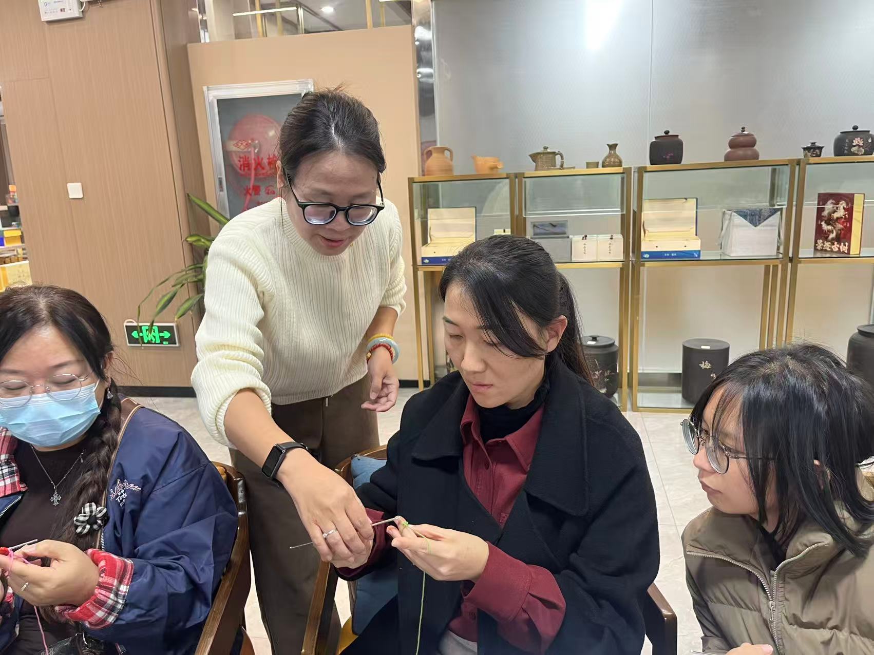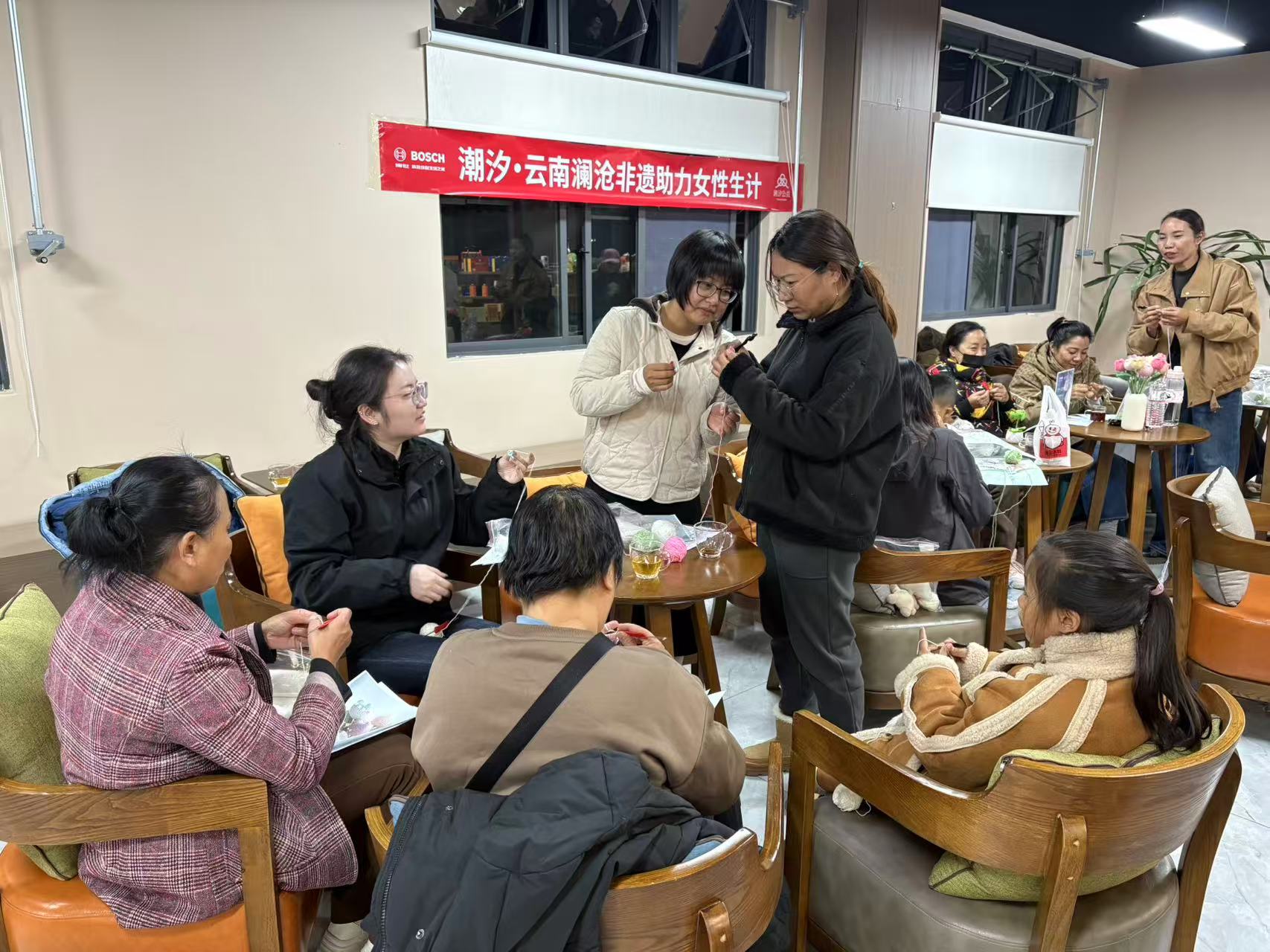 在多方支持与妇联的协作下,她的角色从学习者、创作者,进一步成长为传授者、带动者。她积极参与开班教学,将钩织技艺传递给更多姐妹。学员中,有经验丰富、一点即通的60岁阿姨,钩织是她们重温手艺、发挥余热的舞台;也有跟随母亲前来、充满好奇的10多岁小学生,从最基础的短针学起,最终成功钩织出新年杯垫,收获满满的自信与喜悦。这个跨越年龄的教室,不仅是技能培训点,更是社区情感联结、代际交流的温馨空间,展现了“项目引领、能人带动、姐妹共学、妇联协促”的良性互动模式。