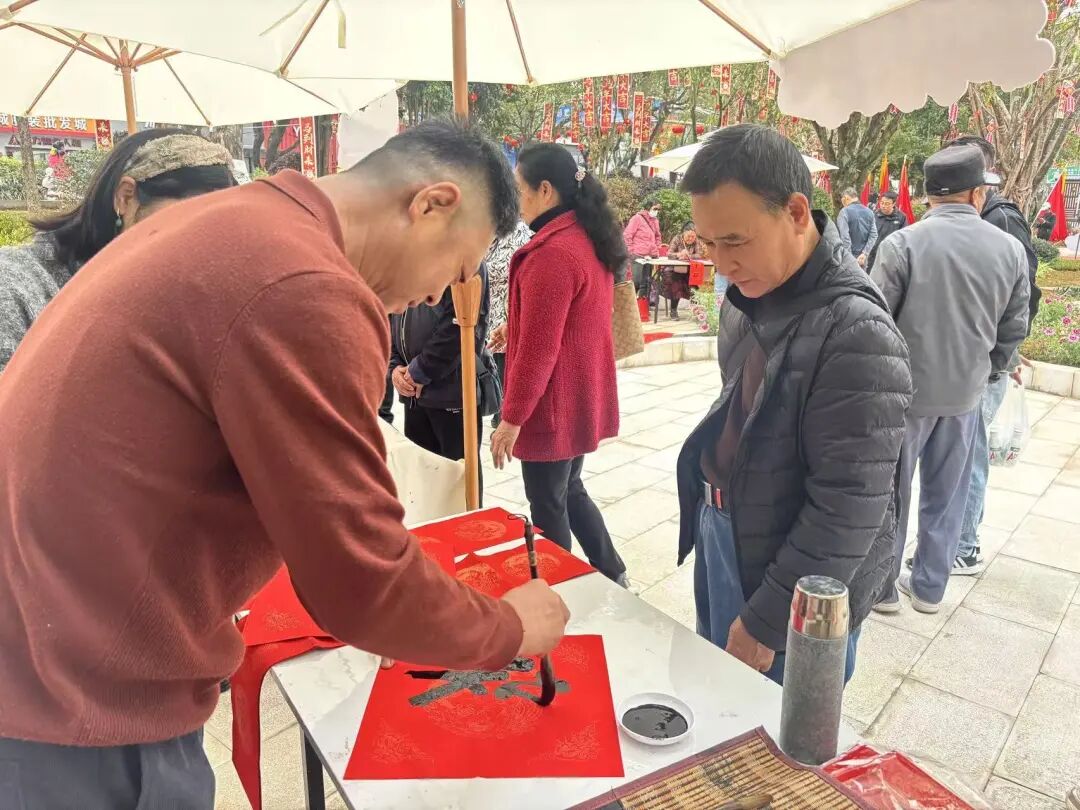 清晨的广场,最动人的莫过于那一抹墨香红韵。写联送福的摊位前,人头攒动却井然有序,书法爱好者们凝神挥毫,笔墨在红纸上流转,化作“岁岁平安”的期许,凝成“年年有余”的美好。