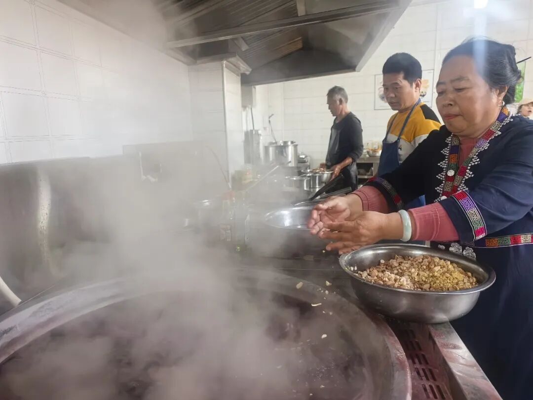 “今天我杀了两头猪,专门招待一直以来照顾我的亲朋好友!”兴江农家乐负责人李兴江忙得脚不沾地,脸上却全是笑意,“杀猪饭是宁洱彝族传承已久的传统民俗活动,年年举办、岁岁相聚。”她要用最地道的彝家做法,让客人们尝到宁洱的年味。院子里,有人翻烤着金黄焦香的火烧肉,滋滋作响;厨房里,药根紫米鸡稀饭正温火慢炖,棕包花的清苦混着肉香……