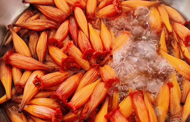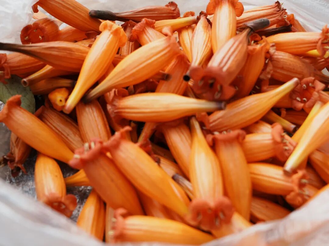 在黎明乡,火烧花从不是仅供观赏的景致,更是大自然馈赠的天然美味,是当地人代代相传的饮食智慧。乡亲们遵循着自然的节律,在花开正盛时,小心翼翼地摘下新鲜的花苞与花瓣,褪去花萼与花蕊,用清水细细洗净,再经沸水汆烫,褪去淡淡的苦涩,留住花朵本身的清甜与韧劲——这一步,是黎明人解锁火烧花美味的关键,既去除了杂质,又最大程度保留其营养与花香。