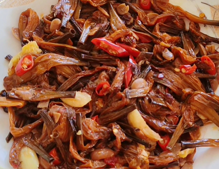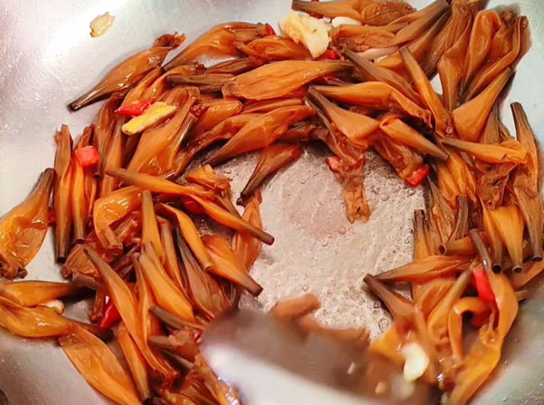 地道的黎明火烧花吃法,藏着最朴素的烟火气。最简单的做法,是热油爆香姜蒜与辣椒,放入焯好的火烧花大火快炒,只加少许水豆豉和食盐调味,便能凸显花朵的本味,入口柔韧清香,微苦回甘,带着山野的清新与纯粹;若想更添风味,便加入当地的腊肉同炒,腊肉的醇香与火烧花的清甜碰撞,油脂浸润着花瓣,每一口都层次丰富,既有肉香的厚重,又有花香的轻盈,是舌尖上的双重享受。除了爆炒,火烧花还能煮汤、凉拌,无论哪种做法,都能将这份春日馈赠的美味发挥到极致,一口下去,便是黎明乡的春天味道。