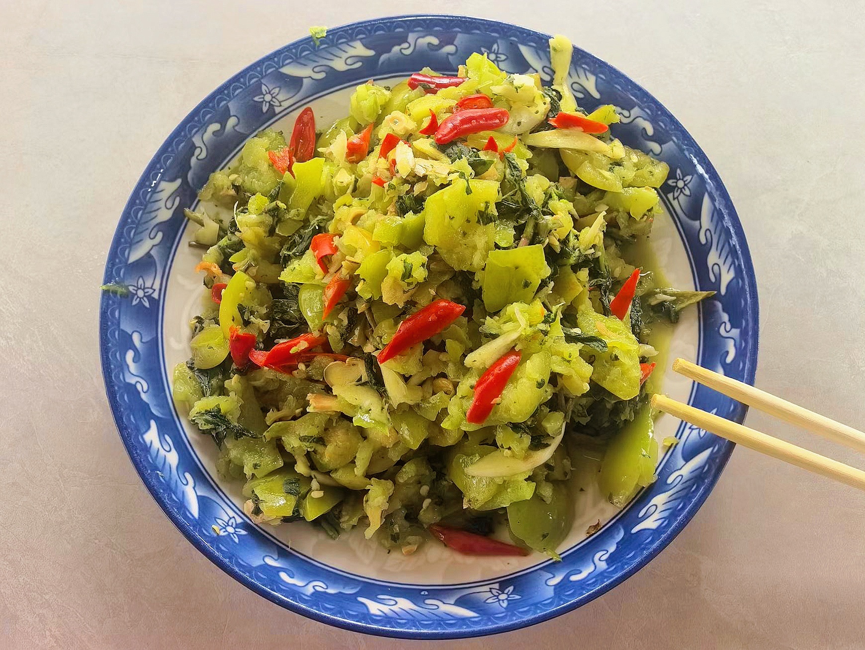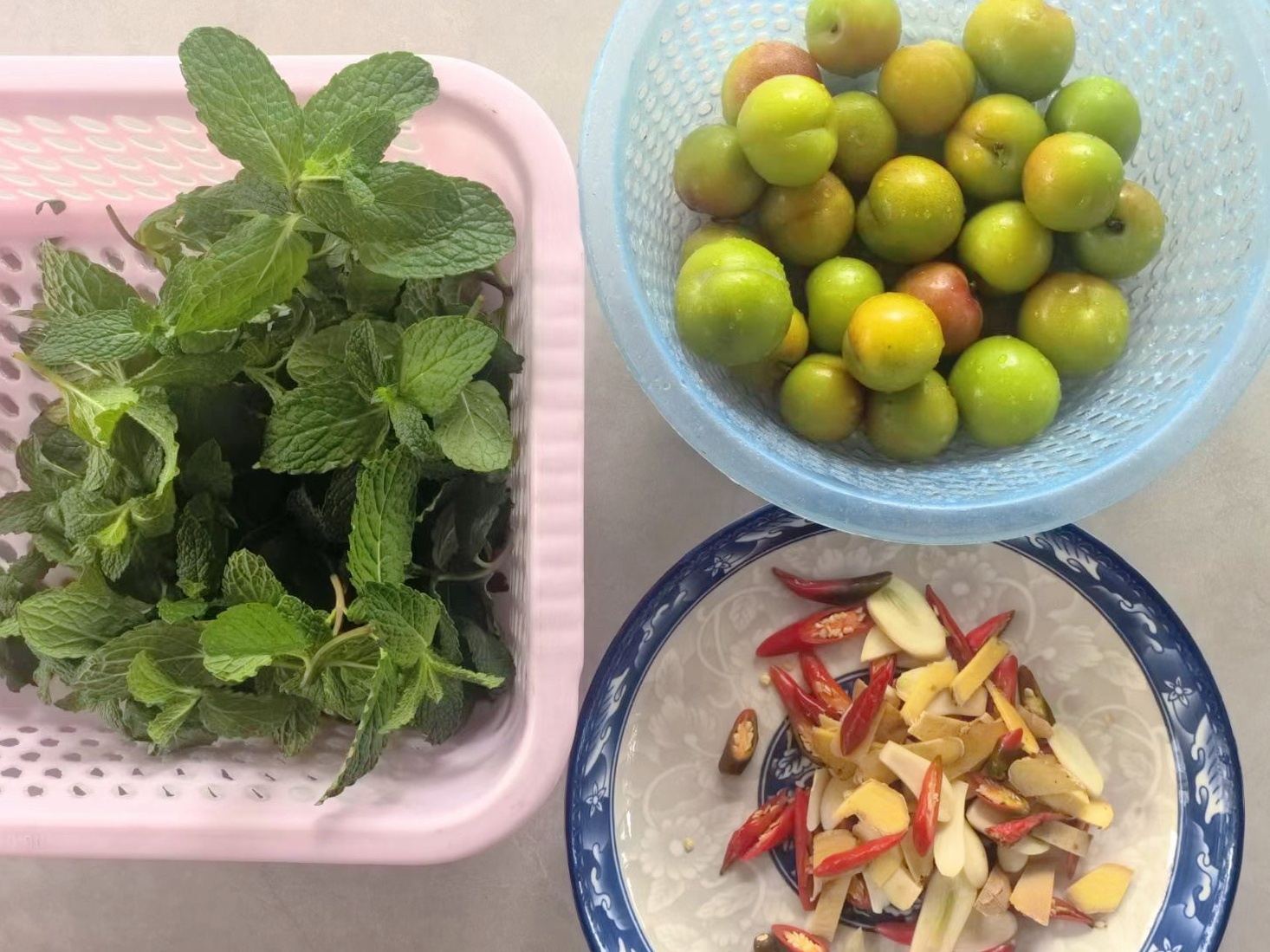 舂李子是普洱民族传统吃法,讲究应季鲜采、现舂现吃。将李子洗净,去除果核,保留脆嫩果肉,薄荷洗净切段,与蒜末、小米辣一同放入石臼中,轻捣至果皮开裂、果肉带颗粒,再以盐、白糖调味,酸辣甜鲜层层迸发,一道清爽开胃的舂李子便大功告成。