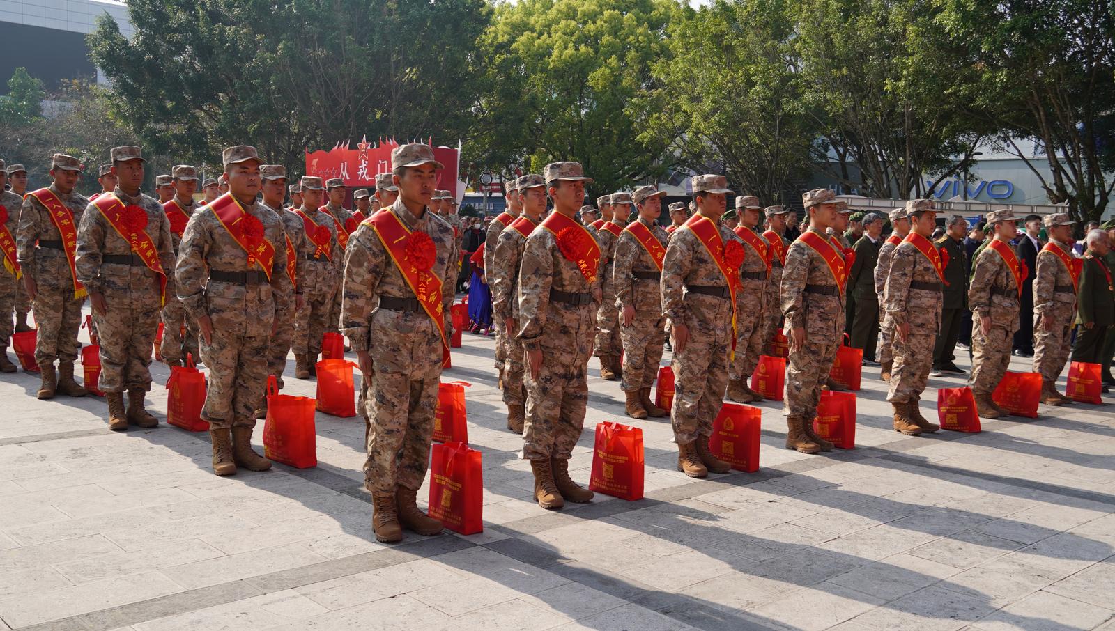 活动现场洋溢着浓烈的爱国拥军氛围,“听党指挥、能打胜仗、作风优良”“参军报国无上光荣”等标语醒目亮眼。身着戎装、身披绶带,军姿挺拔的新兵整齐列队,眼神坚毅、意气风发;光荣退伍、返乡归乡的老兵及参战老兵们军容严整,眉宇间镌刻着军旅岁月沉淀的坚毅与担当,两代军人同场而立,成为广场上最动人的风景。