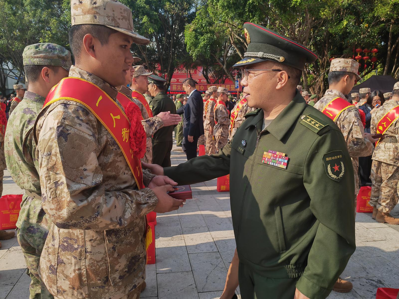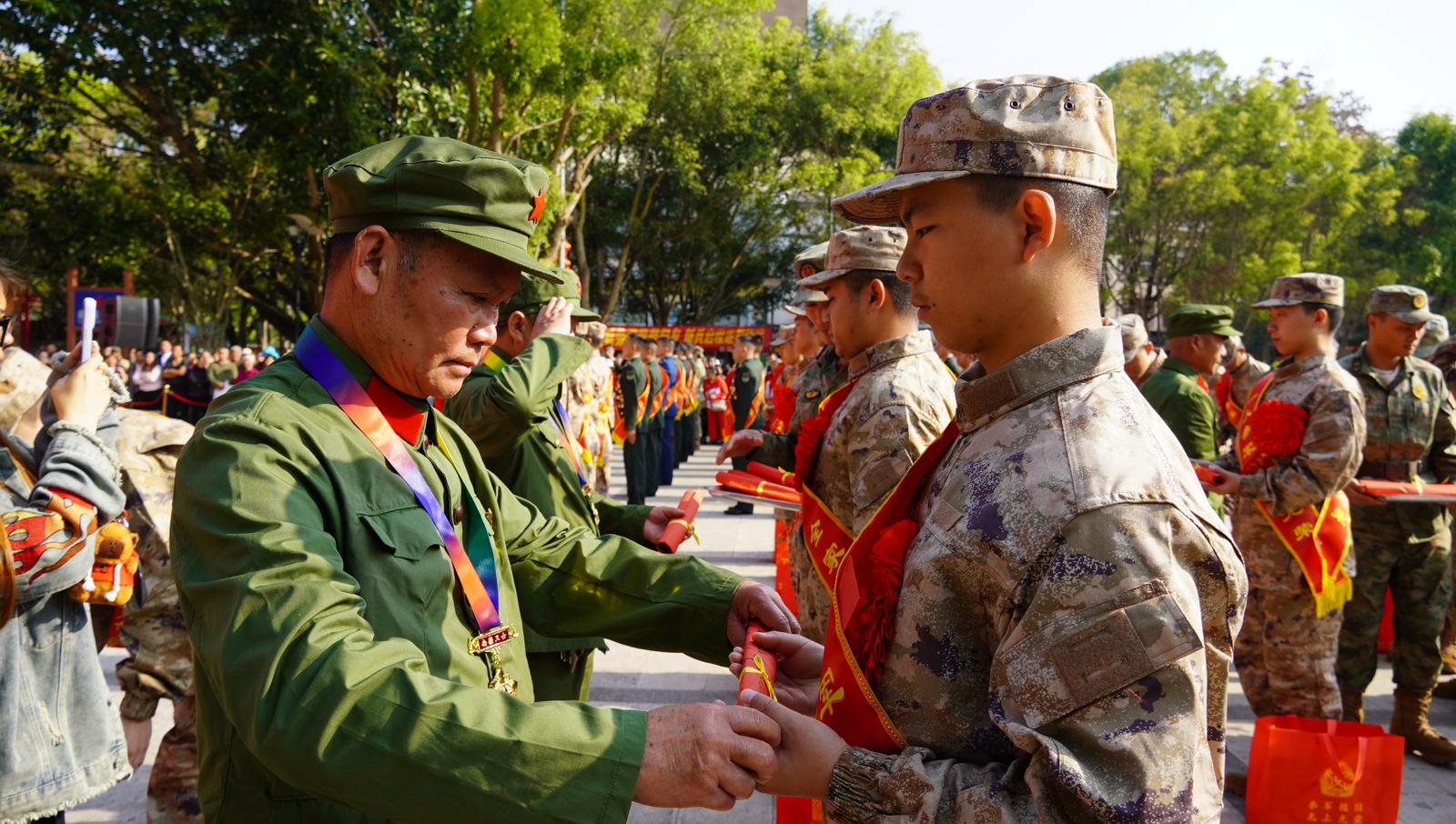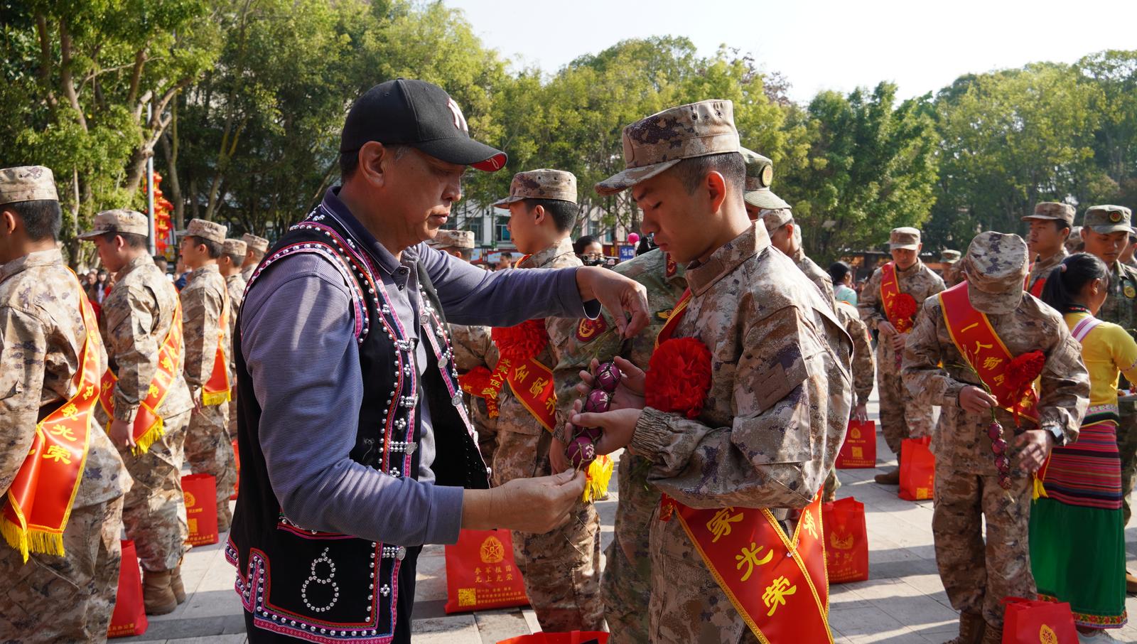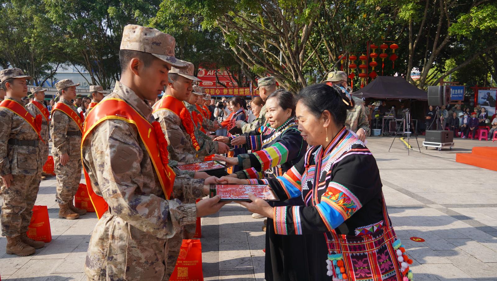 为凸显“民族团结共建美好家园薪火相传勇担强军使命”主题,仪式现场,军地领导、非遗代表性传承人代表、参战老兵及退役老兵代表、新兵家长代表为新兵送上民族团结誓词碑钥匙扣、老兵寄语卷轴、非遗强军剪纸以及寓意新生吉祥的红蛋等象征传承的纪念品。小小钥匙扣镌刻誓言把红色根脉带身边,一卷寄语传承初心与担当,一纸一画既承载梦想又坚定文化自信,一颗红蛋承载家国嘱托与希望,让红色基因和崇军尚武光荣传统继续传承。