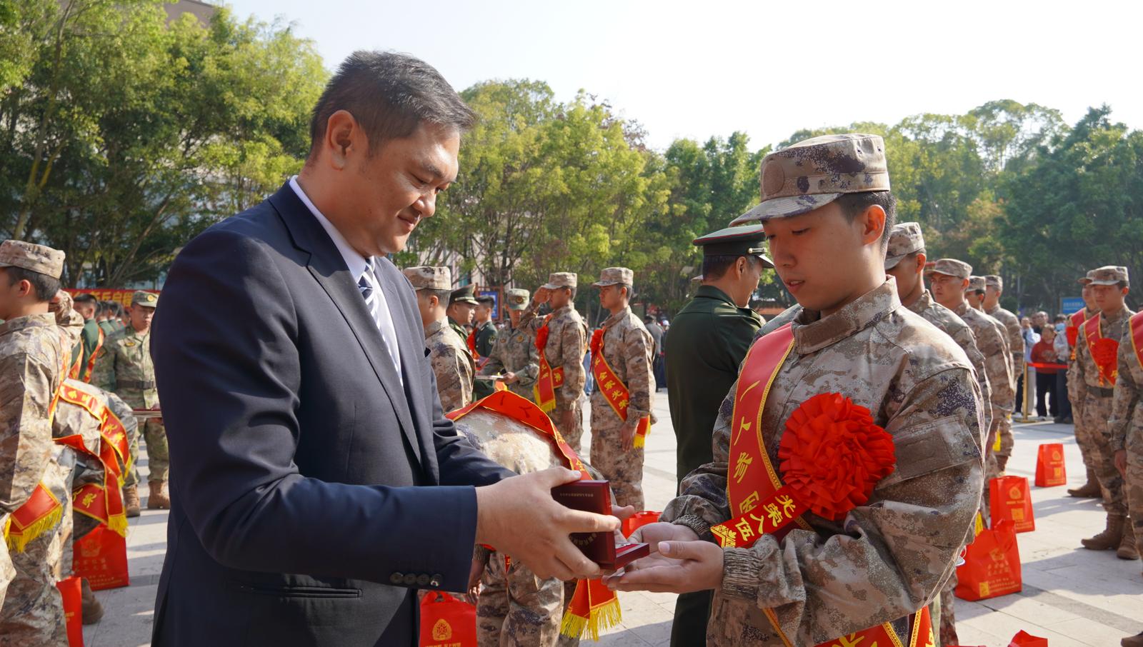 仪式上,宣读了批准入伍新兵名单,新兵代表发言,表达了参军报国的坚定决心,军地领导为全体新兵佩戴“光荣入伍”大红花,为退役军人佩戴“光荣退伍”大红花。