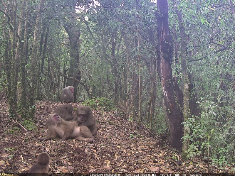 视频中,几只成年短尾猴或坐、或躺在林间的空地上,边食用坚果边相互梳理毛发,姿态妖娆,表情慵懒享受;雪白的幼崽在红外相机前探头探脑,圆溜溜的眼睛瞪着镜头,像个“好奇宝宝”;顽皮的幼猴时而蹦蹦跳跳,时而窜到树上玩起“倒挂金钩”“滑滑梯”……整个画面场景热闹温馨、妙趣横生。
