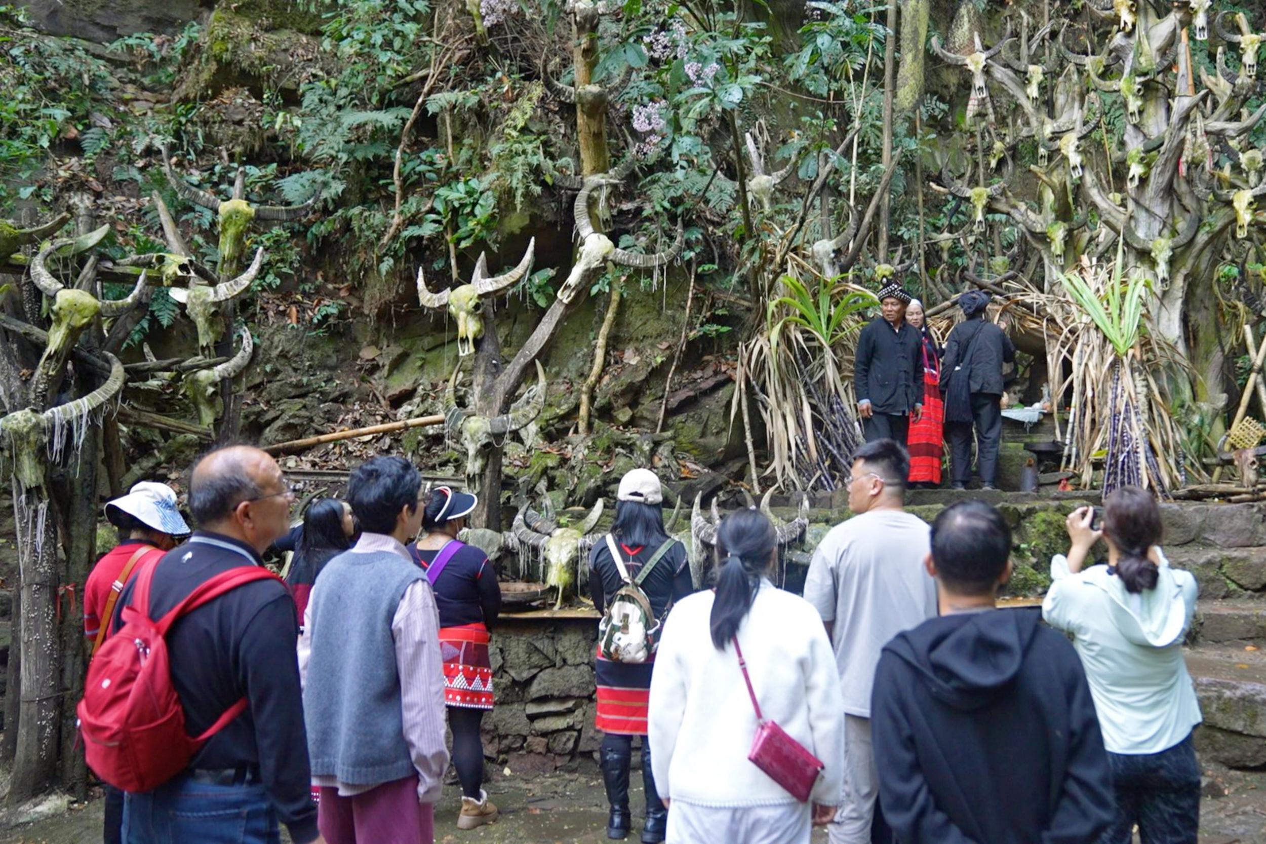 清晨的勐梭龙潭薄雾缭绕,龙摩爷圣地三千余具牛头桩静默矗立,承载着佤族千年的信仰与传承。在德高望重的“巴猜”带领下,身着民族服饰的群众与游客手持芭蕉、甘蔗、茶叶等祭品,沿着林间步道缓步前行,庄重的祭祀仪式正式拉开帷幕。“巴猜”吟诵着古老的祈福咒语,为参祭者系上象征平安吉祥的麻线,大家纷纷将心愿寄托于麻线之上,虔诚地挂在牛头桩间。