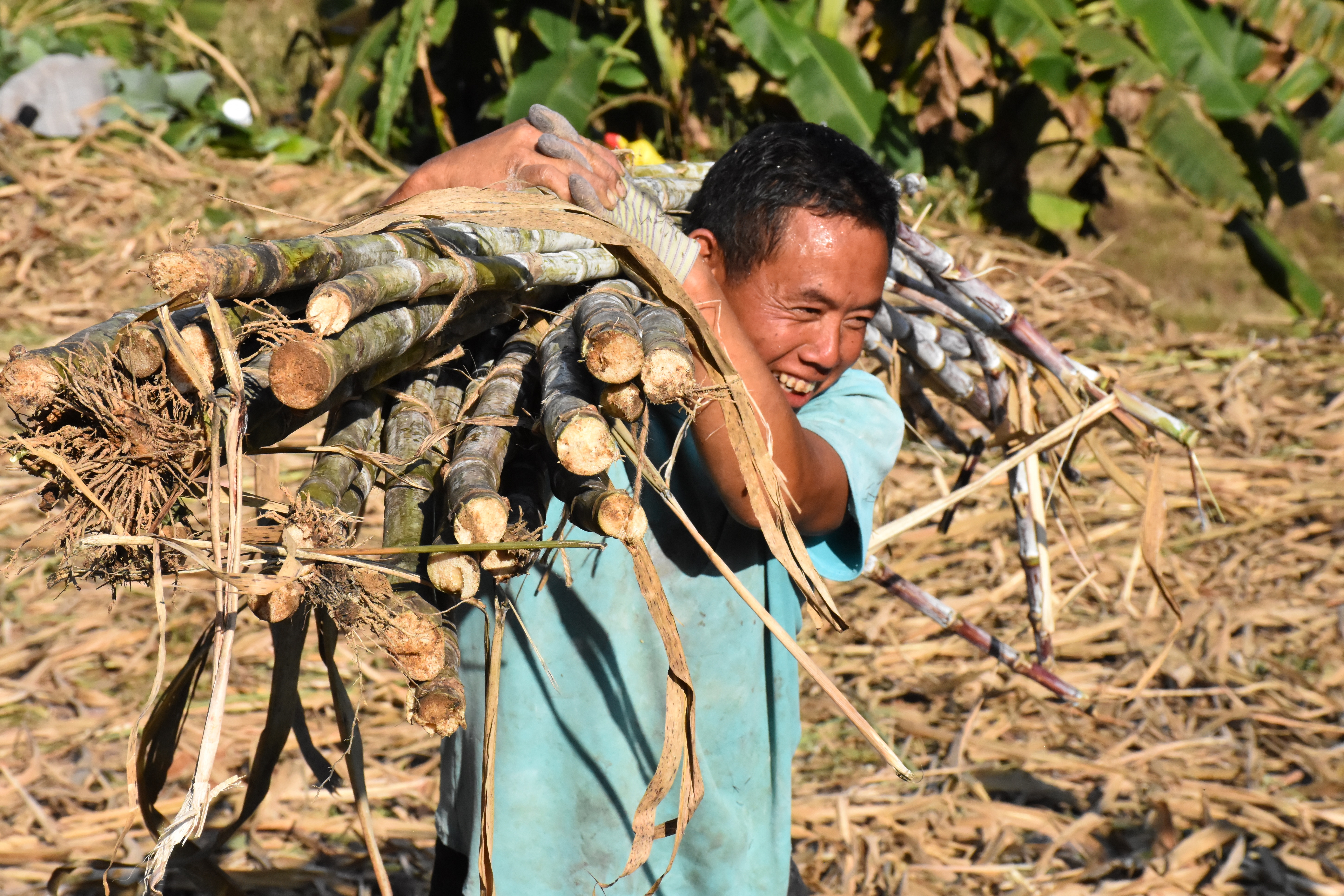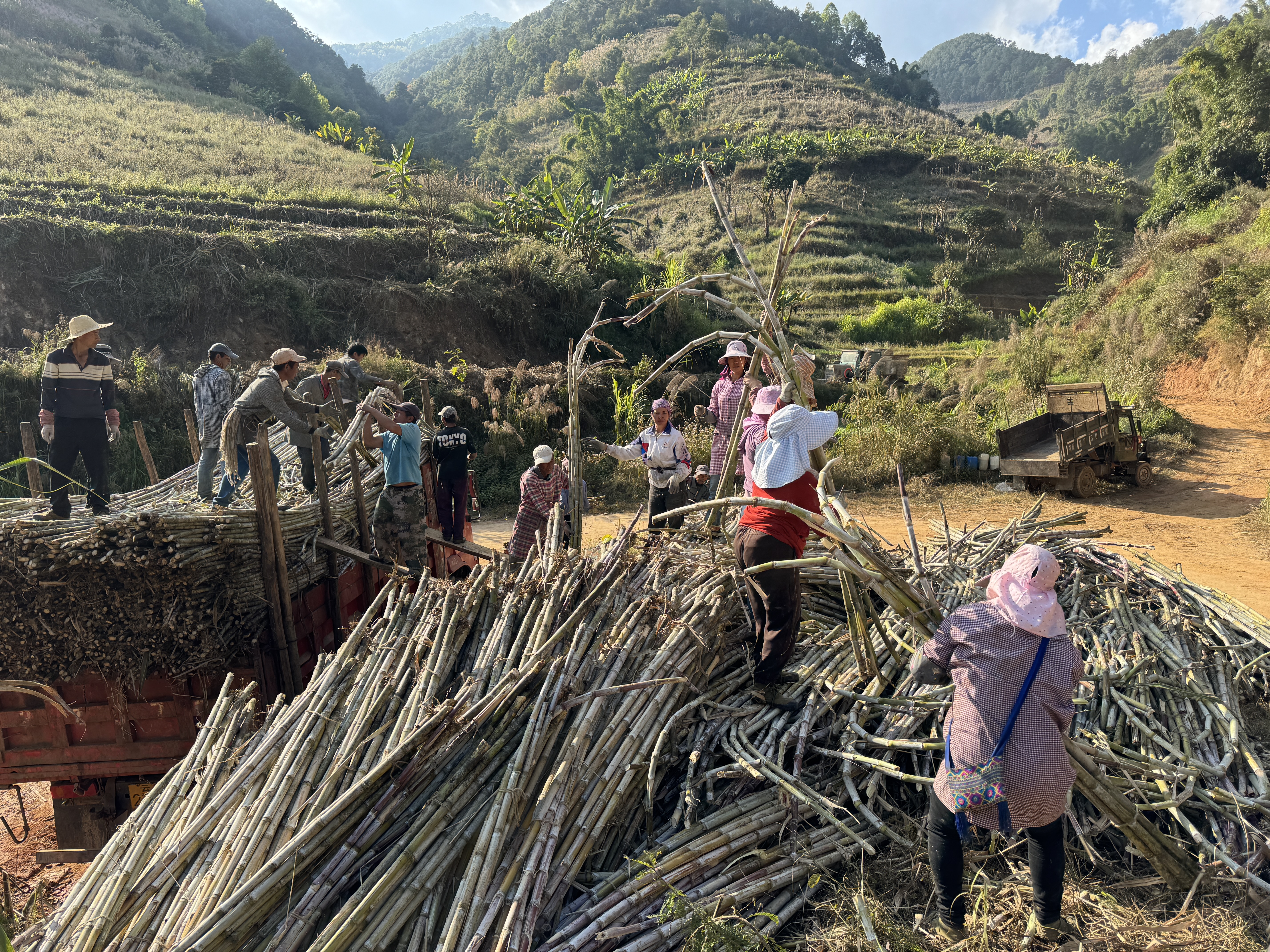 眼下,普洱市澜沧拉祜族自治县富东乡的糖料甘蔗进入丰收季,6500余亩蔗田郁郁葱葱、连绵起伏,翠绿的蔗叶在微风中摇曳,勾勒出一幅生机勃勃的田园画卷。走进桃子树村,蔗农们手持砍刀,熟练地砍削、去叶,再将修整好的甘蔗打捆、搬运,一道道工序有条不紊地推进。