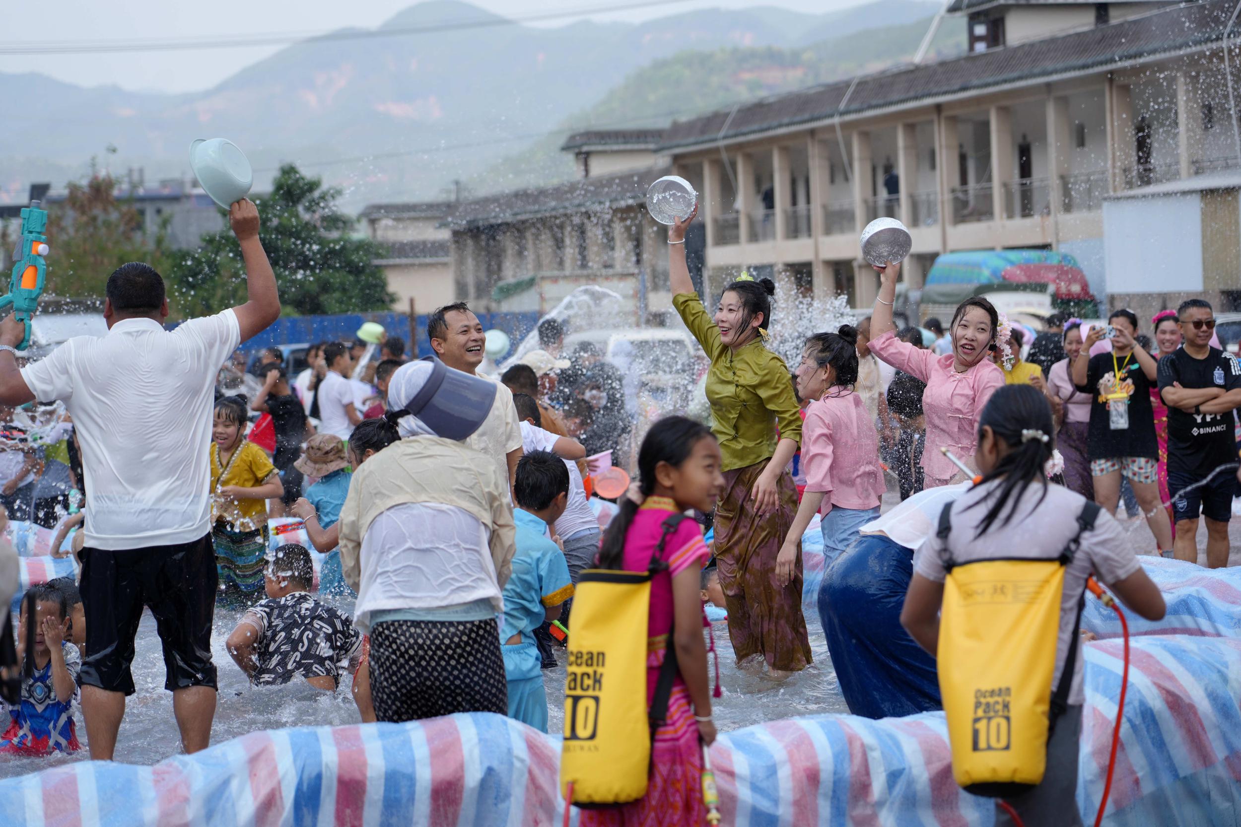 取水仪式后,泼水狂欢正式拉开帷幕。广场上,大家纷纷拿起水枪、水盆等工具,互相泼水送祝福。水花飞溅间,不分民族、不分你我,欢声笑语响彻现场。游客们也纷纷融入其中,相互泼水祝福,用清凉的水传递着吉祥、幸福和美好的祝愿。